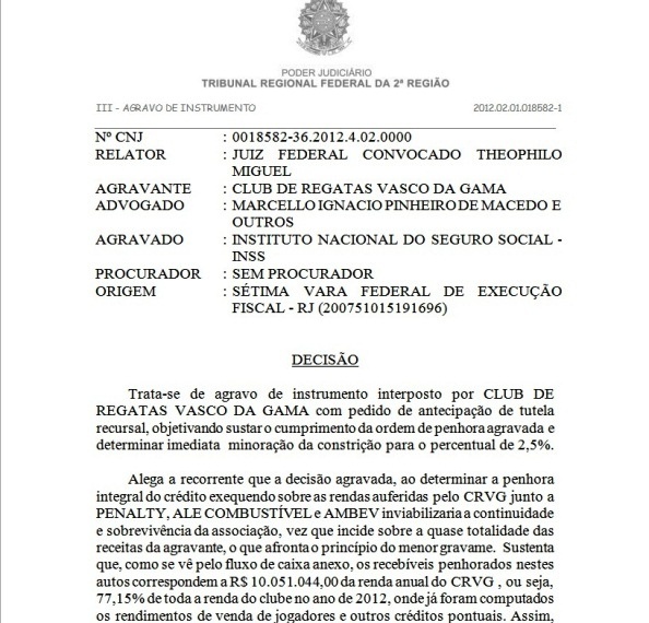 O Vasco deu importante passo para diminuir a asfixia financeira que atinge o clube nos últimos meses. O clube de São Januário conseguiu na Justiça a redução de 90% no bloqueio de parte de suas receitas de 2012. A considerável diminuição é referente à penhora de recursos pelo INSS, instituída ainda no ano passado.